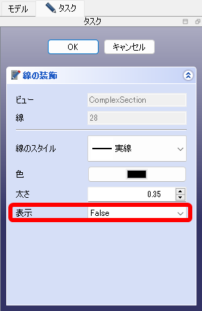 線を選択し、「線の表示を変更」アイコンをクリックするとタスクタブに「線の装飾」パネルが表示されるので「表示」を「false」にします ※詳細な「線の表示を変更」ツールの使用方法は こちら を参照してください |