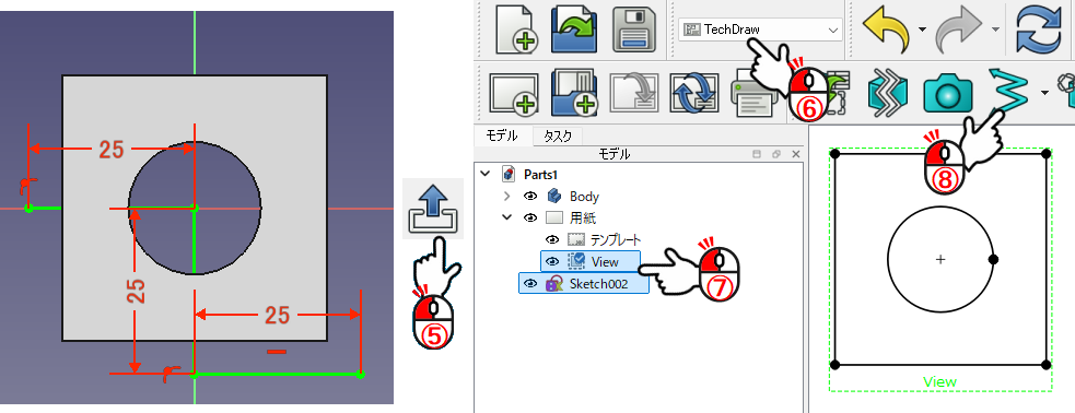 ⑤ 断面指示線をスケッチし、完成したら「スケッチを終了」アイコンをクリックしてスケッチを終了します ⑥「TechDraw」ワークベンチを選択します ⑦ モデルタブのツリーに追加された⑤で作成したスケッチと断面図を作成したいビューを選択します ⑧