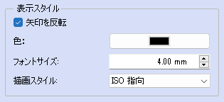 「矢印を反転」にチェックを入れると寸法線の矢印の向きが反転します※ 右図参照 「色」:寸法の色を設定します 「フォントサイズ」:寸法値のサイズを設定します 「描画スタイル」 「ISO指向」「ISO参照」「ASMEインライン」「ASME参照」から選択します |